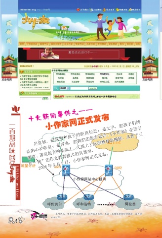 十大新闻事件之—— 一百期品味回忆 小作家网正式发布 是真诚,把我们和孩子的距离拉近;是文字,把孩子们纯 洁的心灵吸引;是网络,把我们的教育延伸; 《小作家》在读书 教育、 课堂教育的基础上, 又插上了远程教育的翅膀。从此“三 位一体”的作文教育模式初具雏形。 2006 年 5 月 5 日,小作家网正式发布。 Li t t le wr i t e r 鱼对水说 :你看不到我的眼泪,因为我在水里。水说 :我能感觉到你的眼泪,因为你 人生感悟 在我心里。 6