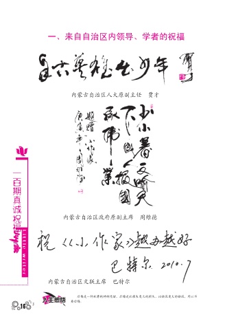 一、来自自治区内领导、学者的祝福 内蒙古自治区人大原副主任 贾才 一百期真诚祝福 内蒙古自治区政府原副主席 周维德 Li t t le wr i t e r 内蒙古自治区文联主席 巴特尔 后悔是一种耗费精神的情绪,后悔是比损失更大的损失、比错误更大的错误,所以不 人生感悟 要后悔。 16