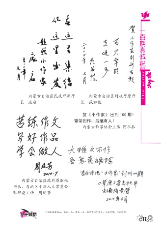 一百期真诚祝福 r e t i wr le 内蒙古自治区民政厅原厅 内蒙古自治区财政厅原厅 t t 长 庞启 长 范游恺 Li 贺《小作家》出刊 100 期! 繁荣创作,后继有人! 内蒙古作家协会主席 阿尔泰 内蒙古自治区政府原副秘 书长,自治区十届人大常委会 财经委主任 周廷芳 日出东海落西山,愁也一天,喜也一天 ;遇事不钻牛角尖,人也舒坦,心也舒坦。 人生感悟 17