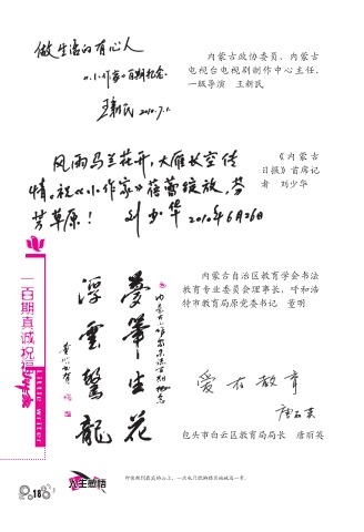 内蒙古政协委员、内蒙古 电视台电视剧制作中心主任、 一级导演 王新民 《内蒙古 日报》首席记 者 刘少华 一百期真诚祝福 内蒙古自治区教育学会书法 教育专业委员会理事长,呼和浩 特市教育局原党委书记 董明 Li t t le wr i t 包头市白云区教育局局长 唐丽英 e r 即使爬到最高的山上,一次也只能脚踏实地地迈一步。 人生感悟 18