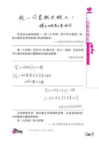 一百期真诚祝福 文艺须从娃娃抓起——祝《小作家》百尺竿头更进一步, 成为爱好文艺的娃娃们的良师益友! ——内蒙古通俗文艺研究会 r e t 愿《小作家》在创刊 100 期之后,再上一层楼,永远为孩 i 子们唱出促进他们健康快乐地前进的歌 ! wr 内蒙古法制报 le t t Li 以百期的声音,回应着文学深情的召唤;以青青的园地, 守护着孩子瑰丽的梦想。 贺《小作家》创刊百期! ——乌兰察布市集宁区作家协会 宁可自己去原谅别人,莫让别人来原谅你。 人生感悟 29