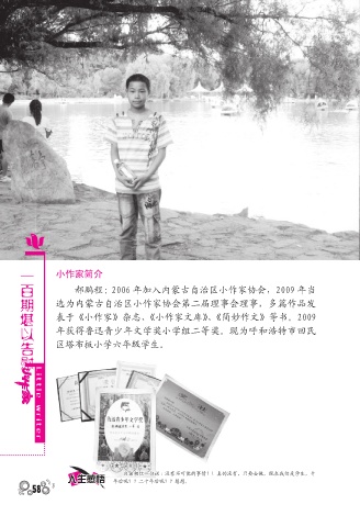 一百期堪以告慰 小作家简介 郝鹏程:2006 年加入内蒙古自治区小作家协会,2009 年当 选为内蒙古自治区小作家协会第二届理事会理事,多篇作品发 表于《小作家》杂志、《小作家文库》、《简妙作文》等书。2009 年获得鲁迅青少年文学奖小学组二等奖。现为呼和浩特市回民 区塔布板小学六年级学生。 Li t t le wr i t e r 应该相信一句话 :没有不可能的事情!!真的没有,只要去做,现在我们是学生,十 人生感悟 年后呢??二十年后呢??想想。 58
